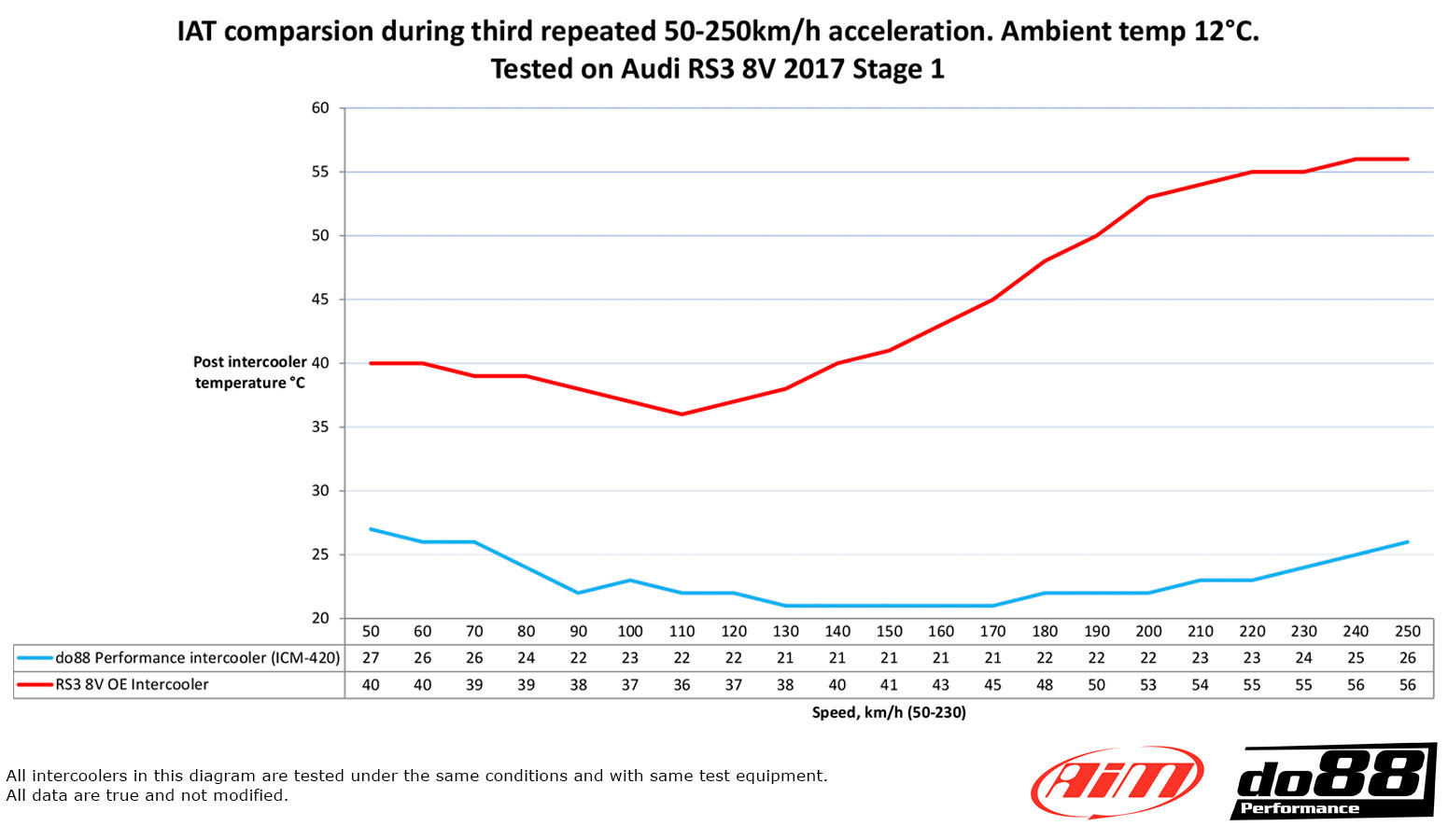 - Alhaisempi sisääntuloilman lämpötila samanlaisissa olosuhteissa: 23°C verrattuna OEM:n 55°C. Vaikuttava 32°C alempi! Tarkat arvot löytyvät diagrammeista tuotekuvien alla.