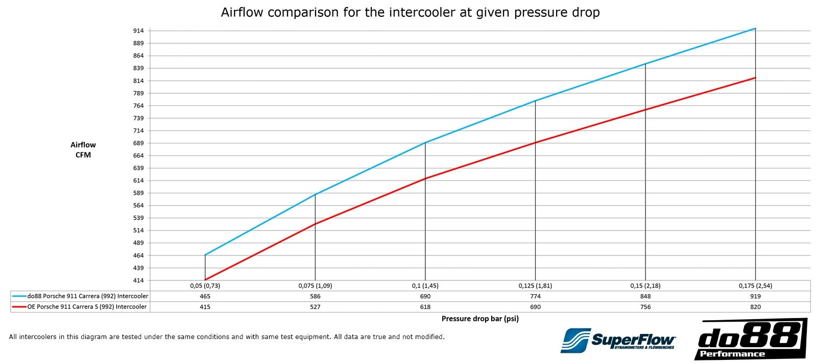 Cooling is important, and so is airflow. After many hours in the development, refining the end tanks and choosing a core to meet our demand, the result is an intercooler that is much more efficient in terms of heat transfer as well as airflow. Using our in-house flowbench, Superflow SF-1020 Probench, the airflow is verified for both the do88 intercoolers and the OE 992 units. What you see is what you get – true performance!
