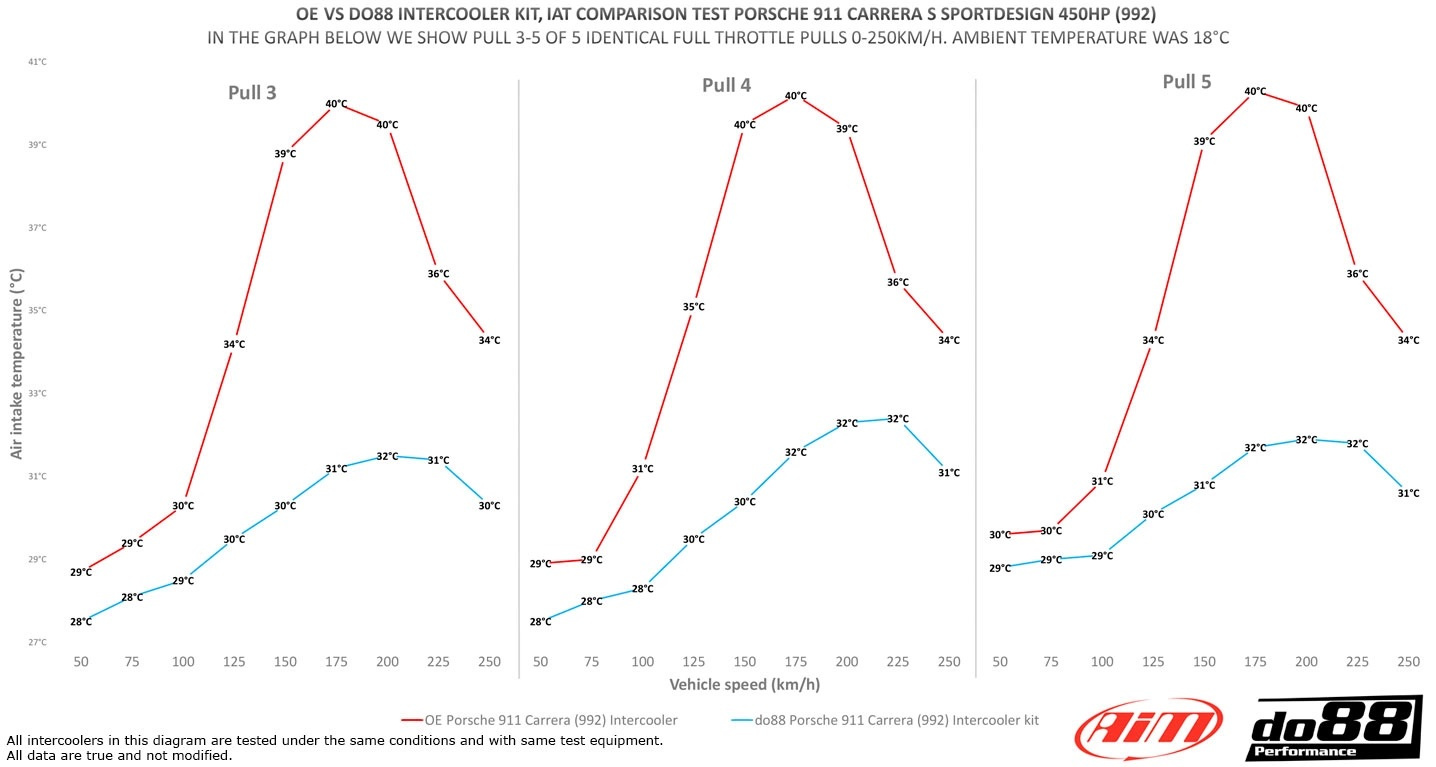 Firstly, 5 runs were made with the car equipped with the 992 OE intercoolers. Stop, fast change of parts to the do88 intercoolers. Shakedown for a few minutes and then five runs made in the exact same way as with the OE parts. The decrease in inlet air temperature is significant, peak delta is 9°C (16,2 F). See the graph under the product pictures!