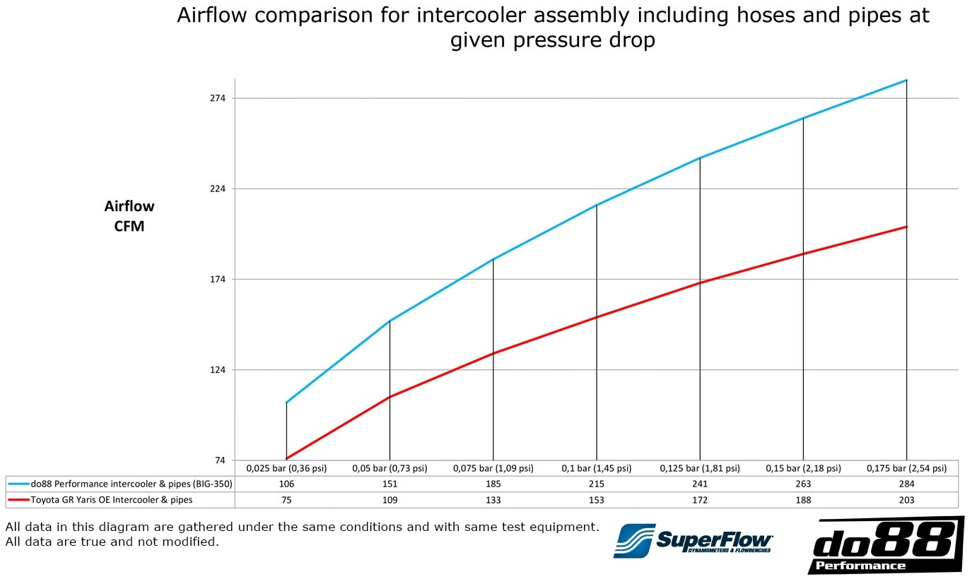 - Ilmavirtaus 0,175 bar / 2,54 psi paineen alenemalla: 284 CFM vs 203 CFM, 40 % korkeampi!