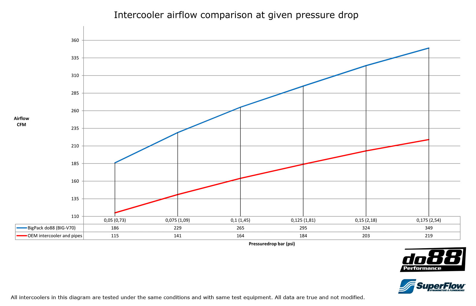 Jos tavoitteesi on optimoida moottorin teho ja vaadit vain parasta, niin tämä BigPack on ehdottomasti oikea valinta! do88:n välijäähdyttimissä ja ahtoputkissa on huomattavasti parempi ilmanvirtaus kuin alkuperäisissä jäähdyttimissä ja putkissa, tämän olemme testannut ja vahvistanut useilla testeillä sekä autoissa ja meidän SuperFlow SF-1020 virtaus testipenkissä.