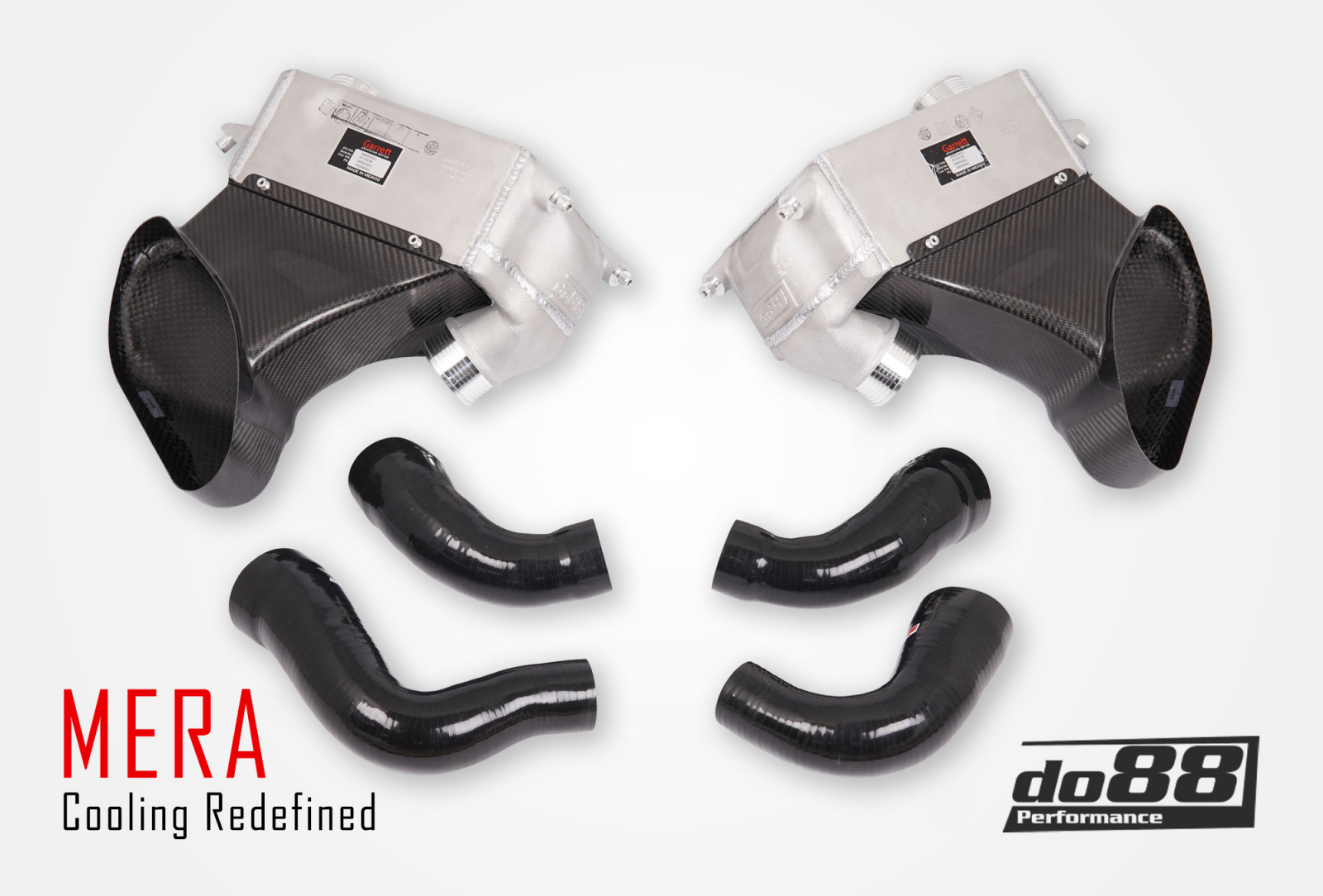 Välijäähdyttimissä on valetut päätysäiliöt, jotka jakavat ilmavirran erittäin tarkasti koko kennoston yli. Tämä on erittäin tärkeää, koska hyvä säiliön muotoilu on hyödyllinen sekä painehäviön että jäähdytystehokkuuden kannalta. Jotta voimme sovittaa autoon välijäähdyttimen, jolla on tehtävään sopiva paksuus, oli myös tarpeen suunnitella uusi yläpuolinen ympäristöilman ohjain. Tämä suunniteltiin 3D-skannatusympäristössämme varmistaaksemme täydellisen sopivuuden ajoneuvon integroituihin ilmanohjaimiin sekä välijäähdyttimeen. Poistaaksemme pullonkaulat vielä enemmän, MERA-välijäähdytinsarjassa on 70 mm (2 3/4 tuumaa) välijäähdytinputket, jotka todella mahdollistavat ilman esteettömän kulkemisen. Tämä tarkoittaa myös, että jokaiseen kohtaan sisältyy uudet letkut, jotka kaikki on suunniteltu 3D-teknologialla maksimaalisen ilmavirtauksen huomioiden. Kaikki letkut on testattu CFD-menetelmällä varmistaaksemme tämän. Turbon ulostulon letkut on valmistettu korkean lämpötilan eritelmän materiaalista, joka kestää jatkuvan lämpötilan 240°C (464°F). Jotta voisimme todella hyödyntää kaiken lämmön siirtävän ympäristöilman, hiilikuitukanavat on varustettu asianmukaisilla tiivisteillä auton runkoa vasten, pakottaen kaiken ilman kulkemaan läpi kennoston, eikä pääsemään karkuun sen ympäriltä.