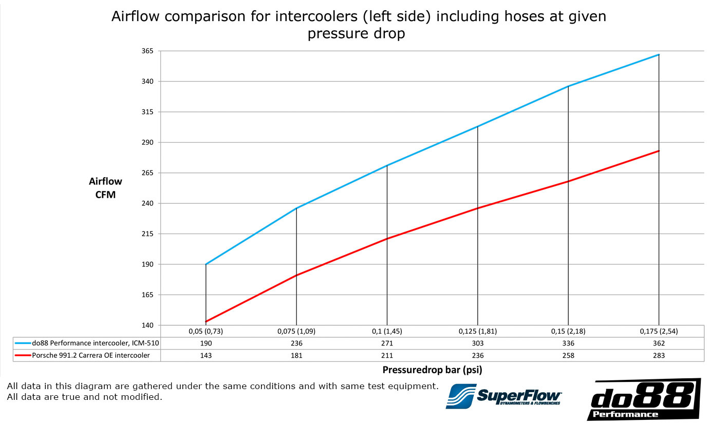 Jäähdytys on tärkeää, ja niin on ilmavirtauskin. Monien kehitystuntien jälkeen, päätysäiliöiden jalostamisen ja kennoston valinnan jälkeen, tuloksena on välijäähdytin, joka on paljon tehokkaampi sekä lämmönsiirrossa että ilmavirtauksessa. Käyttämällä omaa Superflow SF-1020 Probenchiamme, ilmavirta varmennetaan koko järjestelmänä, letkut sekä sisään- että ulostulossa, sekä OEM 991 välijäähdyttimille että do88 suorituskykyisille välijäähdyttimille.