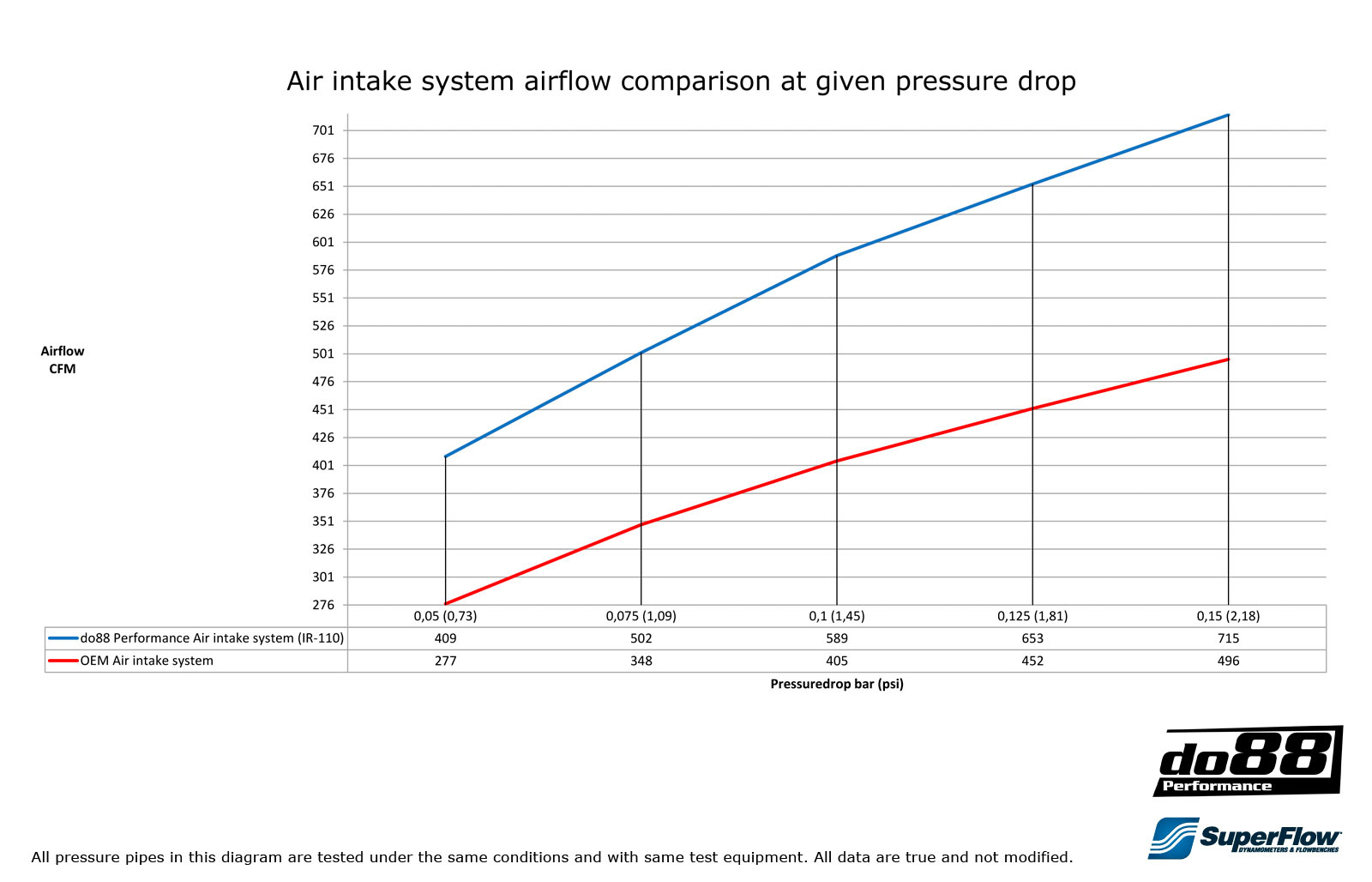 do88:an turbo imuputkella on ilmavirta 653CFM 0,125baarin/1,81psi painehäviöllä, verrattuna alkuperäiseen putkeen jossa on 452CFM!
