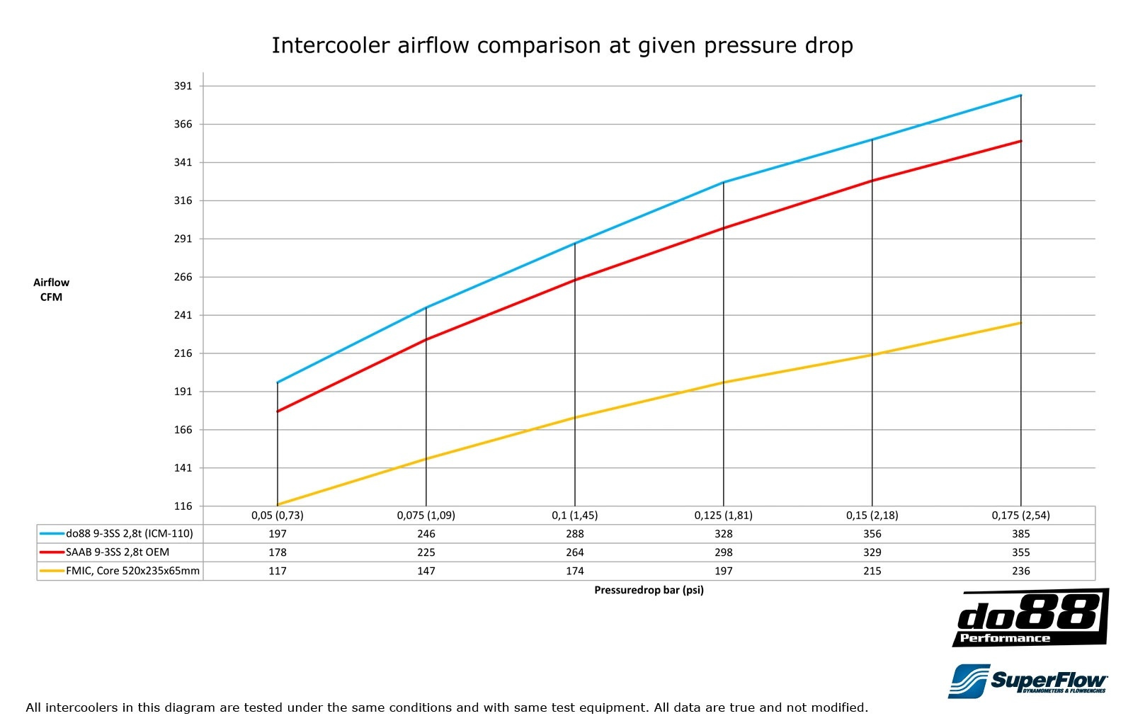 - Ilmavirta 0,15bar/2,18psi painehäviöllä: 356CFM (329CFM), do88 8% korkeampi!