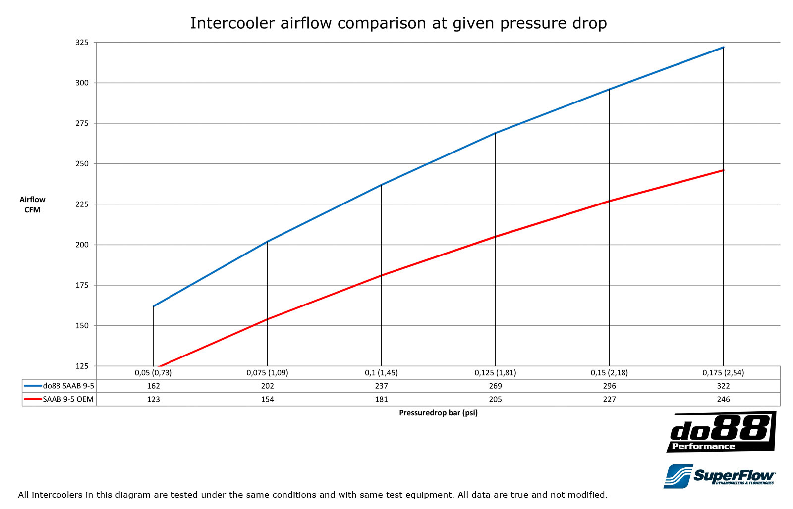 - Ilmavirta 0,15bar/2,18psi painehäviöllä: 296CFM (227CFM), do88 30% korkeampi!