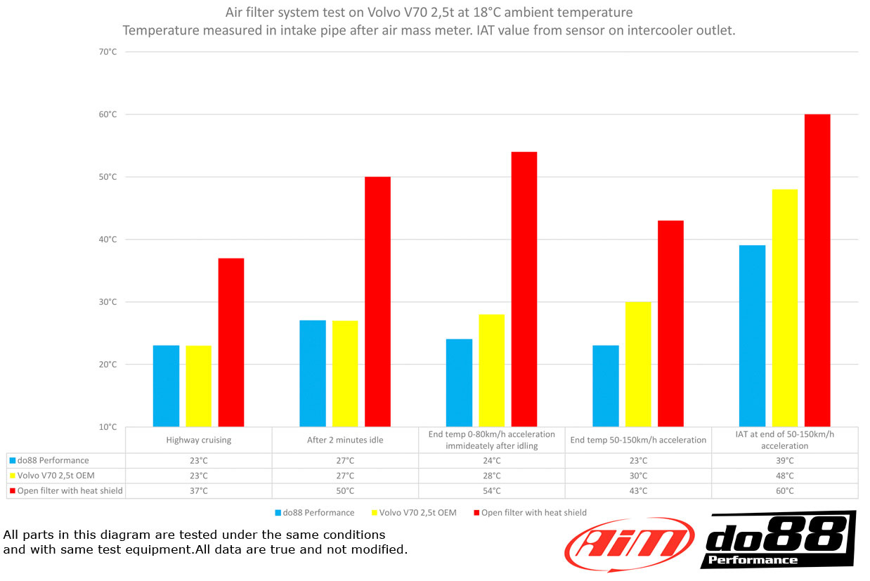- 9 °C (16 °F) alhaisempi IAT kuin OEM ja 21 °C (38 °F) matalampi kuin avoimella suodattimella ja lämpösuojalla