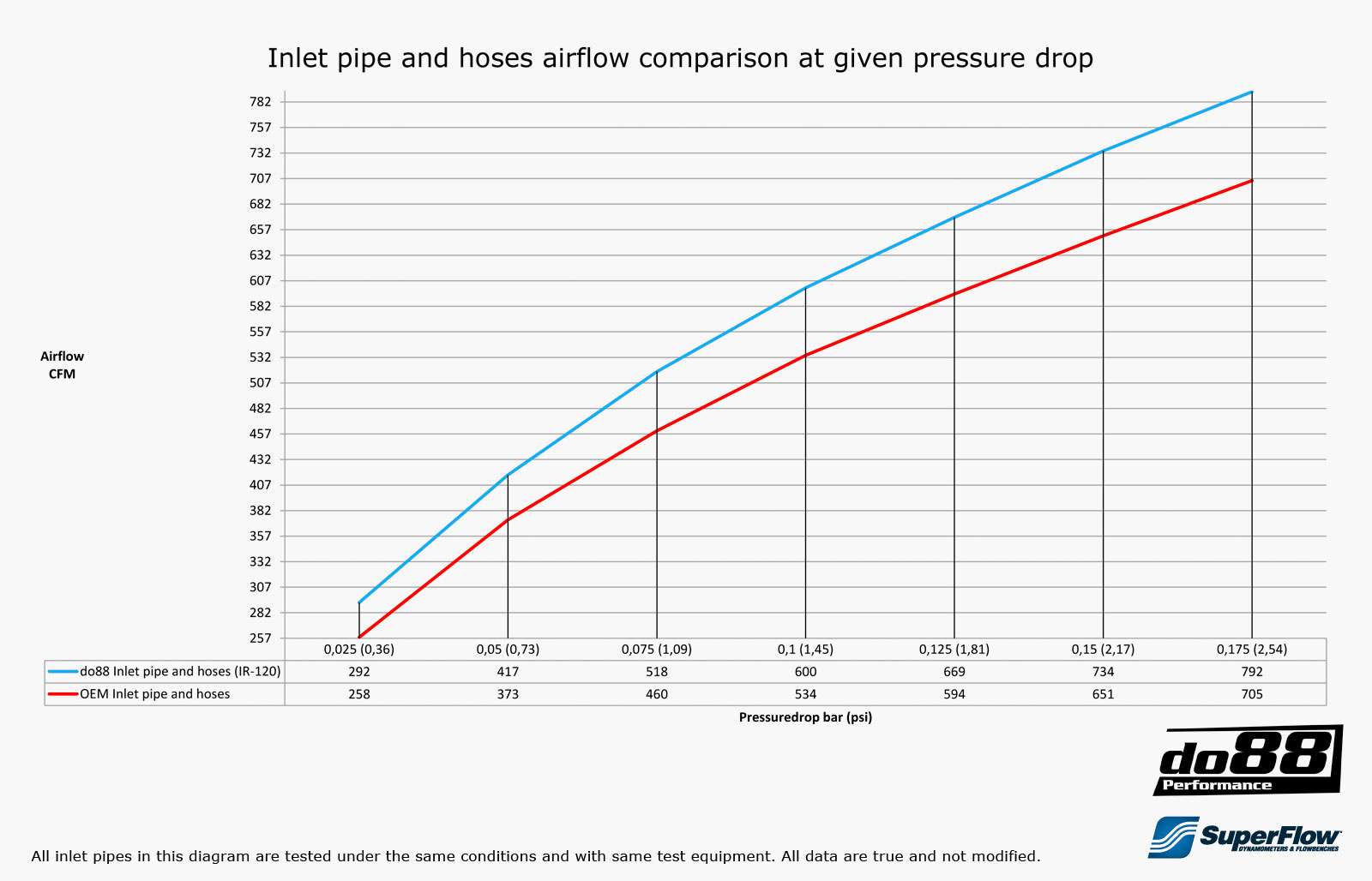 do88:an turbo imuputkella on ilmavirta 669CFM 0,125baarin/1,81psi painehäviöllä, verrattuna alkuperäiseen putkeen jossa on 594CFM. Turbon imuputki on valmistettu 3'' saumattomasta alumiinista jotka on pursotettu yhtenä kappaleena ja tuurna taivutettu. Räätälöity korkealaatuiset silikoniletkut jossa on 4-kerroksinen polyesteri vahvistus ja teräslanka. Nämä letkut kestävät erittäin korkeita paineita ja lämpötiloja!